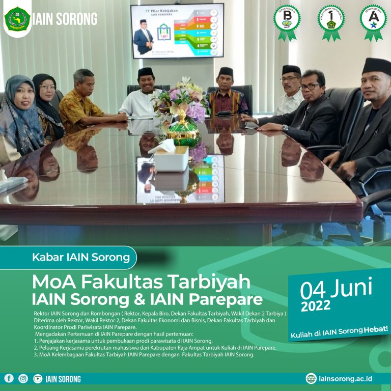 Sabtu, 04 Juni 2022. Rektor IAIN Sorong dan Rombongan ( Rektor, Kepala Biro, Dekan Fakultas Tarbiyah, Wakil Dekan 2 Tarbiyah ) diterima oleh Rektor, Wakil Rektor 2, Dekan Fakultas Ekonomi dan Bisnis, Dekan Fakultas Tarbiyah dan Koordinator Prodi Pariwisata IAIN…