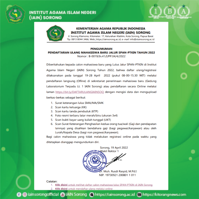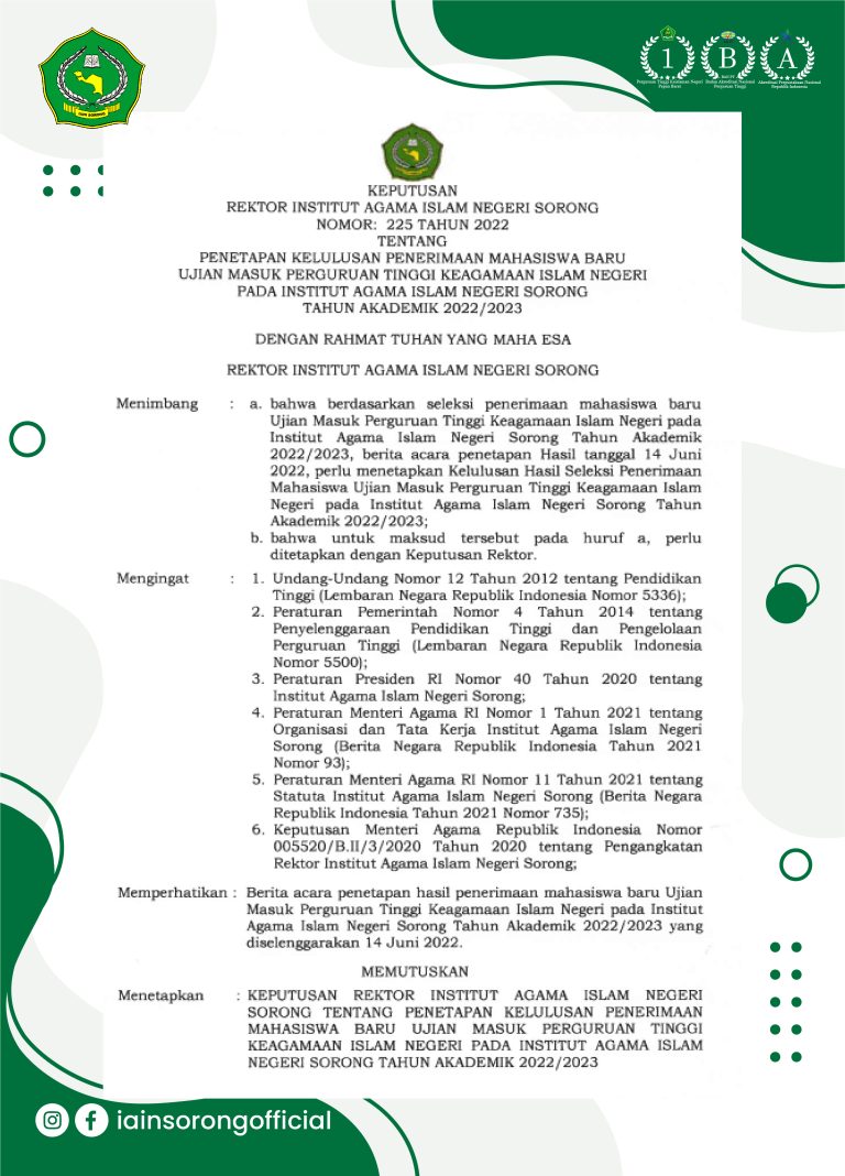Pengumuman Hasil Verifikasi Persyaratan Administrasi Bakal Calon Rektor Institut Agama Islam Negeri Sorong Periode 2024-2028