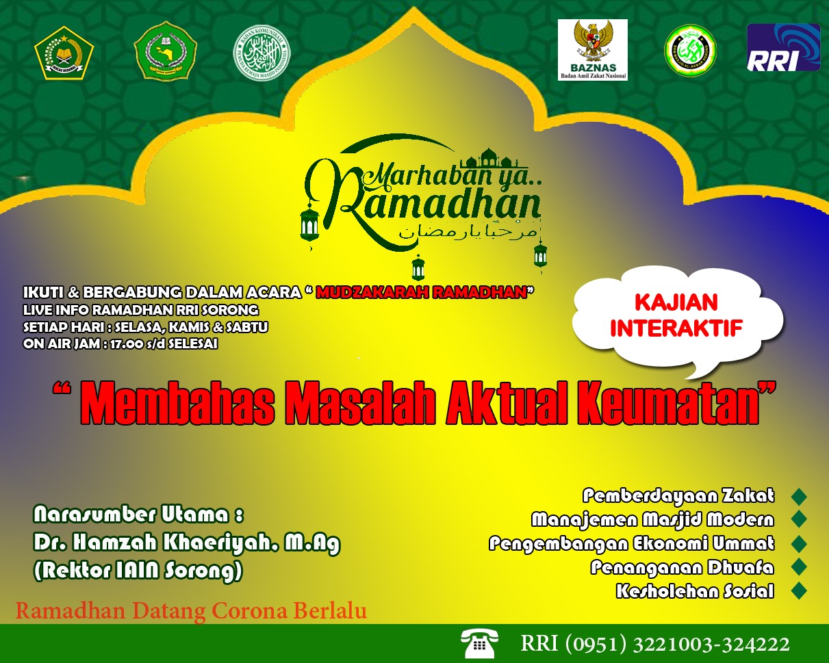 Selain video ceramah singkat tersebut, Dr. Hamzah, M. Ag., juga diminta sebagai narasumber di acara Kajian Interaktif “Muzakarah Ramadhan” setiap hari Selasa, Kamis, dan Sabtu, pukul 17.00 Wit s.d. selesai. Acara yang diselenggarakan oleh RRI Sorong bekerja sama dengan Kanwil Papua Barat, IAIN Sorong, PCNU Kota Sorong, dan Baznas Kota Sorong tersebut membahas seputar masalah aktual keumatan.