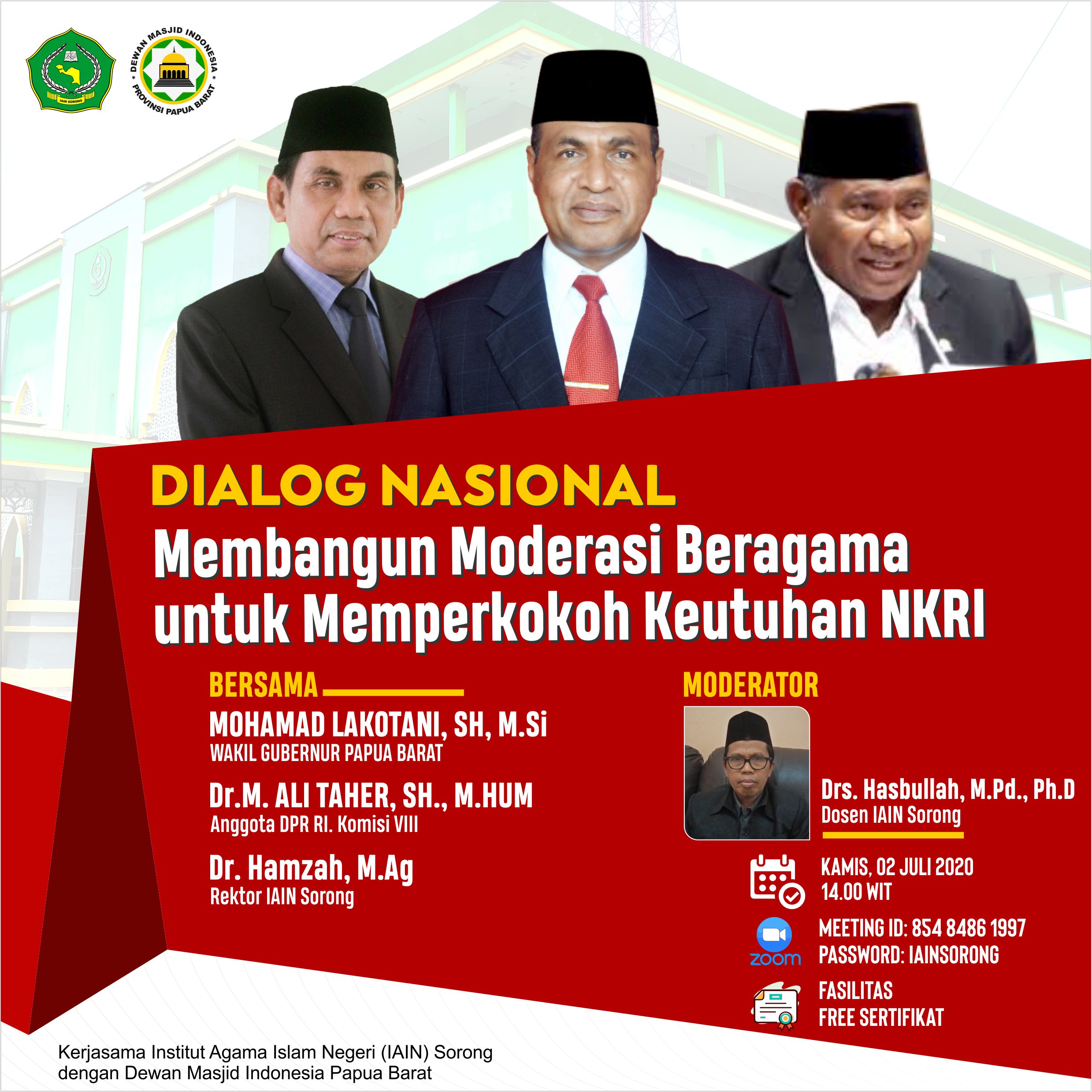 Sorong, iainsorong.ac.id – Institut Agama Islam Negeri (IAIN) Sorong mengundang Wakil Gubernur Papua Barat, anggota DPR RI, anggota DPD RI Dapil Papua Barat, pendeta, kyai, pimpinan perguruan tinggi, dan tokoh pemuda, guna membahas tentang moderasi beragama untuk memperkokoh keutuhan NKRI, pada acara webinar Dialog Nasional dengan tema “Membangun Moderasi Beragama untuk Memperkokoh Keutuhan NKRI”, Kamis, 2/7/2020.