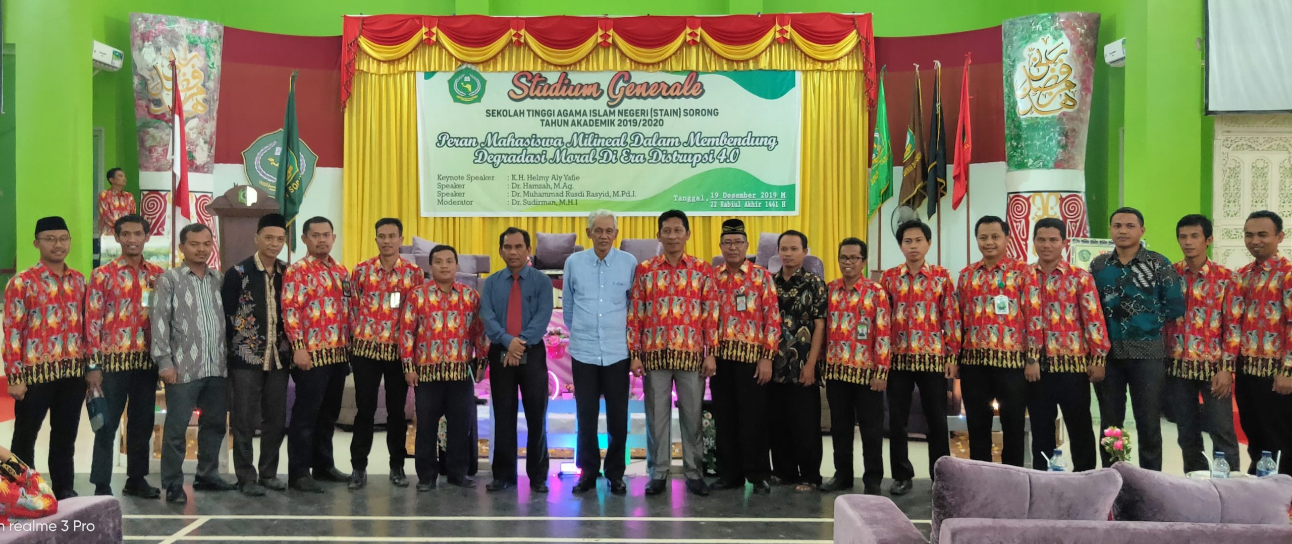 Sorong, iainsorong.ac.id – Menjelang pergantian tahun 2019 dijadikan sebagai momentum yang sangat berharga oleh Sekolah Tinggi Agama Islam Negeri (STAIN) Sorong untuk menyongsong semangat baru, budaya baru, dan semangat kerja yang baru. Dalam momen ini STAIN Sorong menggelar Studium Generale dengan tema “Peran Mahasiswa Milenial dalam Membendung Degradasi Moral di Era Disrupsi 4.0” pada hari Kamis, 19/12/2019.
