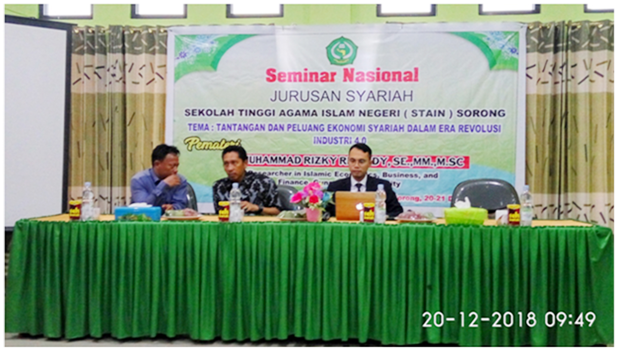 Jum’at, 21 Desember 2018 di Ruang Dosen Lantai II Jurusan Syariah Melaksanakan Seminar Nasional dengan Tema Tantangan dan Peluang Ekonomi Syariah Dalam Era Revolusi Industri Jilid 4,0. Dengan Narasumber Bapak Muhammad Rizky Rizaldy, S.E., MM., M.SC. Kegiatan ini di buka oleh ketua STAIN Sorong dalam hal ini di Hadiri oleh Wakil Ketua I Bidang Akademik dan Lembaga Bapak Dr. Muhammad Rusdi Rasyid, S.S., M.Pd.I. dalam sambutan nya beliau menyampaikan bahwa Semoga Kegiatan Seminar Nasional ini dapat di ikuti dengan baik oleh seluruh mahasiswa syariah dan berjalan lancar hingga selesai. Semoga kegiatan ini dapat menjadi Motivator untuk para peserta dalam mengahadapi tantangan ekonomi revolusi jilid 4. Kegiatan tersebut berlangsung 2 hari yang di ikuti oleh seluruh Dosen dan mahasiswa syariah.
