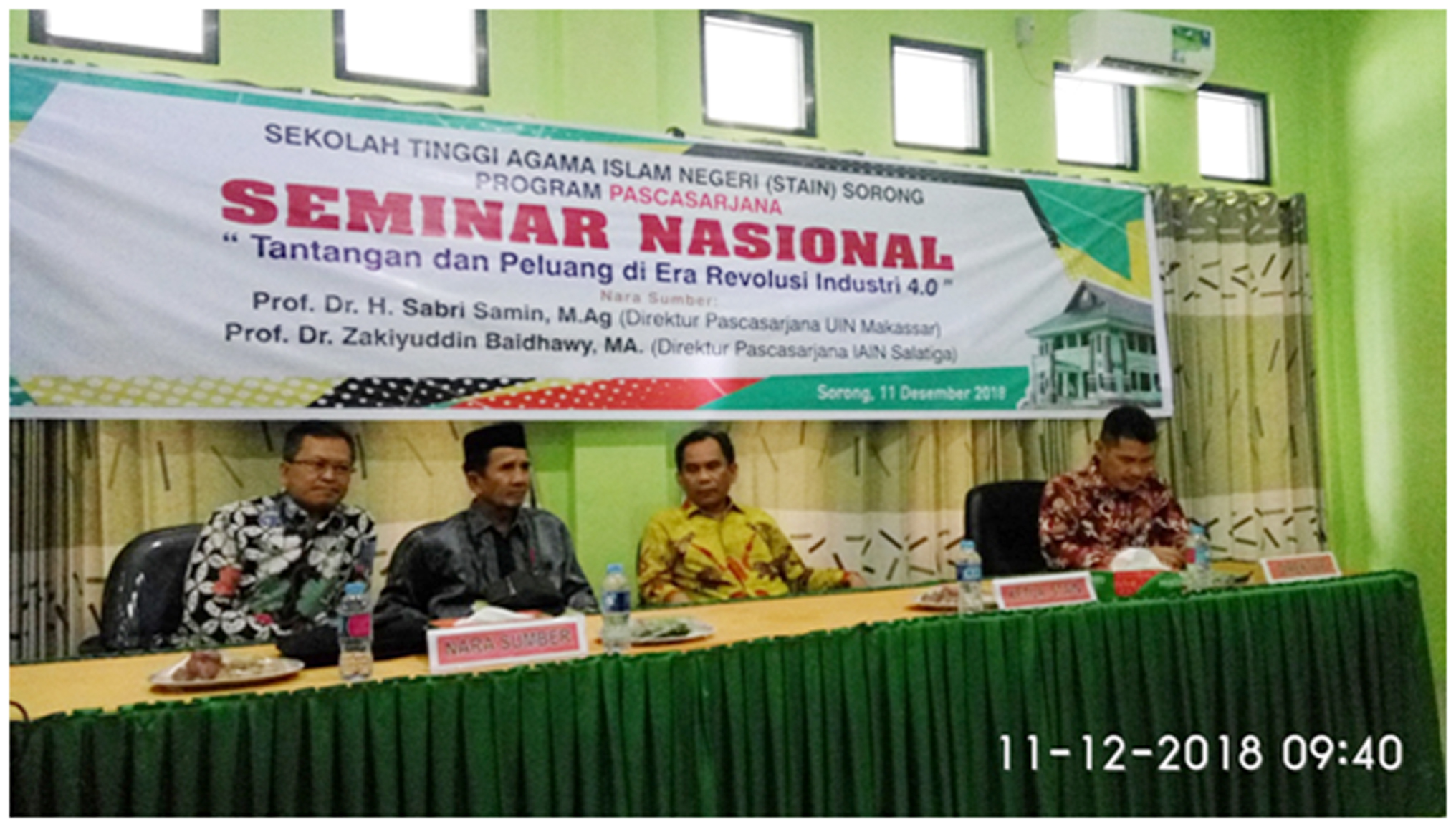 Seminar Nasional yang di Laksanakan oleh Program Studi Pascasarjana STAIN Sorong yang mengangkat tema tentang “Tantangan dan Peluang di Era Revolusi Industri Jilid 4,0 dengan mendatangkan Pemateri atau Narasumber Bapak Prof. Dr. H. Sabri Samin, M.Ag (Direktur Pascasarjana UIN Makassar) dan Bapak Prof. Dr. Zakiyuddin Baidhawy, M.A. (Direktur Pascasarjana IAIN Salatiga)