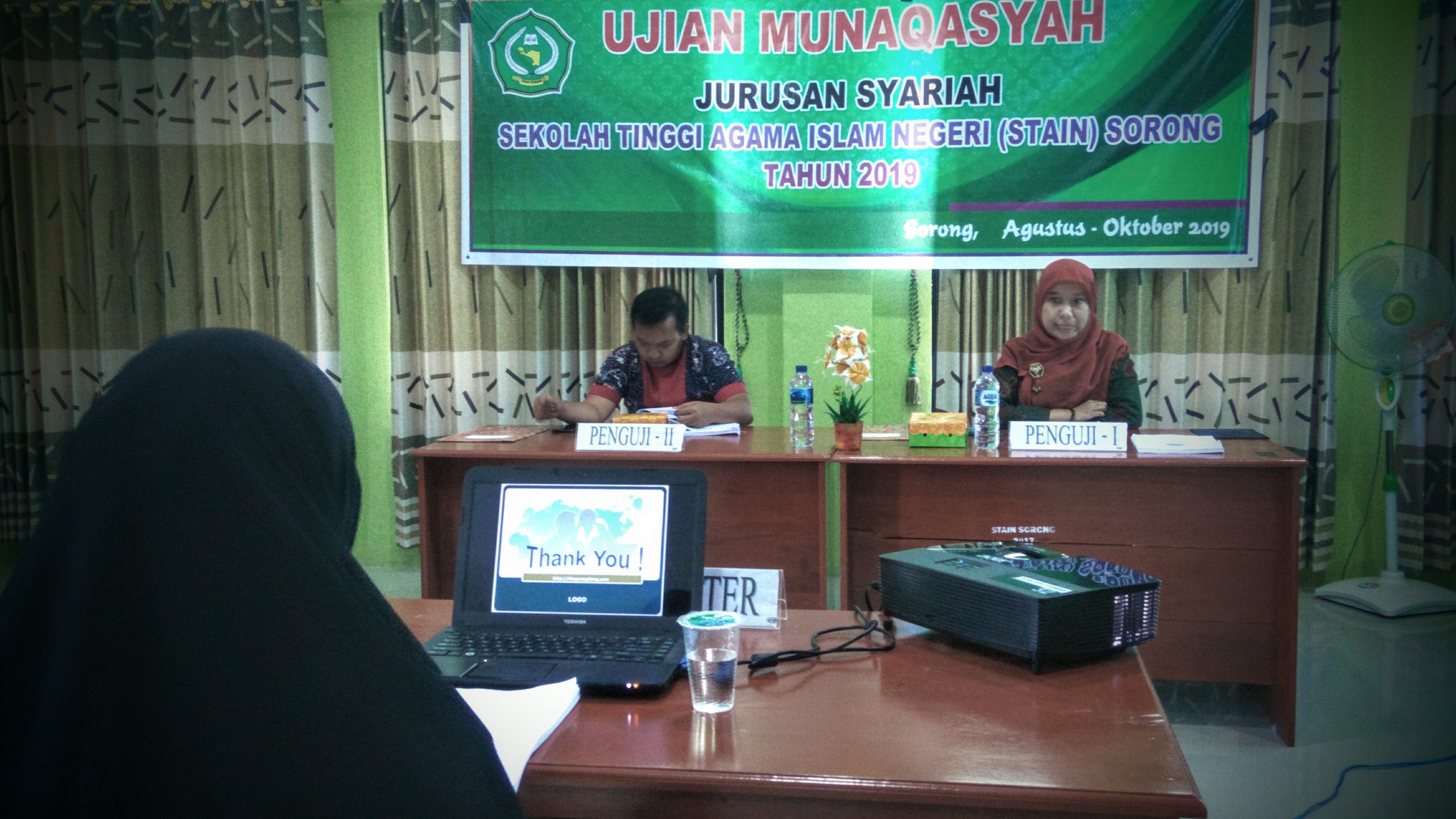 Jurusan Syariah ,29/08/2019. Ujian Munaqosah untuk menguji kemampuan Mahasiswa/i dalam pemahaman Akademik dan penulisan tugas akhir bagi Mahasiswa Program Studi Ekonomi Syariah dan Akwal Syahsiyyah telah dilaksanakan pada bulan Agustus-Oktober 2019 di Kampus STAIN Sorong. Ujian Munaqosah terdiri dari penguji1, penguji2 dan moderator, dan di saksikan Orang Tua Wali beserta Audience, Ujian Munaqosah dimulai pada Pukul 08.00 WIB sampai selesai.